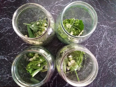 Банки тщательно вымойте и положите на дно зеленые листья хрена, лист смородины, вишневые веточки с листьями, а также чеснок с укропом. Зелень можно предварительно измельчить: порезать ножом или порвать руками.