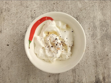 Для заправки смешала густую сметану, соль, душистый перец и лимонный сок. Мне кажется небольшая цитрусовая кислинка хорошо подходит к этому салату.