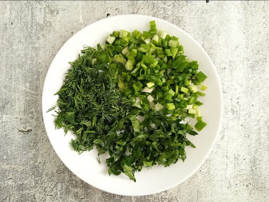 Зелень лука и укропа промойте и хорошо обсушите. Лишняя жидкость в салате сделает его водянистым и не вкусным. Мелко нарежьте. Добавьте нарезанный лук и укроп в салатницу.