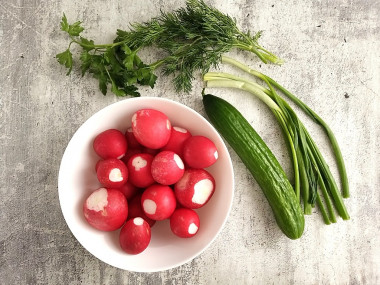 Редиску и огурцы я нарезала тонкими полукружьями. Из зелени взяла укроп, петрушку и зеленый лук.