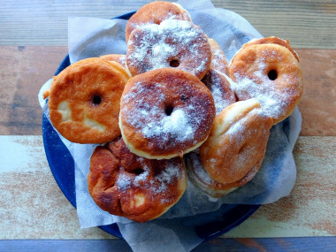 Из дрожжевого теста для пирогов в хлебопечке я хотела напечь пирожков с яйцом, но дочка попросила сделать пончики. Я не была уверена, что такое тесто подойдёт для пончиков. Но попытка не пытка. Нажарила пончиков по просьбе дочери. Пончики получились очень пышные и мягкие. Они получились поплотнее, чем если готовить из теста для пончиков. Они не сладкие, по вкусу напоминают немного пирожки. Но с сахарной пудрой очень даже вкусно.