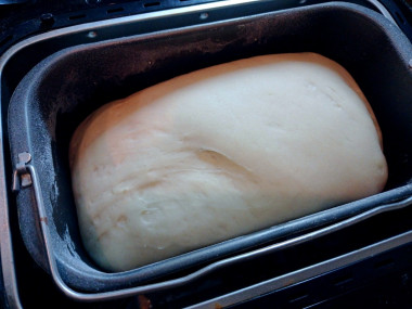 Очень люблю готовить тесто в хлебопечке: быстро, просто, очень удобно. В чашу хлебопечки я сначала налила воду, потом насыпала просеянную муку, соль и дрожжи (в разные углы чаши), сахар и масло, нарезанное кусочками. На замес и подъём теста ушло полтора часа.