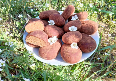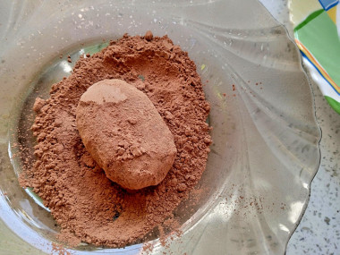 Уплотняя массу из песочного печенья руками, сформируйте "картофелинки" небольшого размера овальной формы. Я делала пирожные по 70 г каждое.