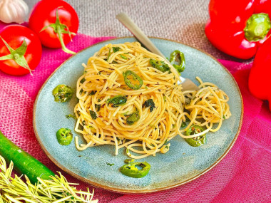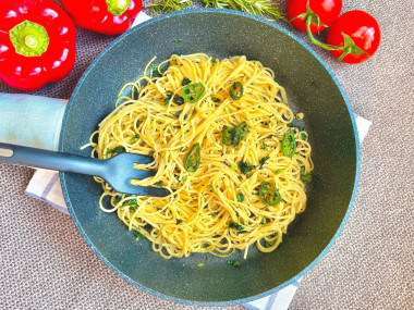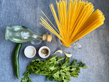 Сделала аппетитный гарнир по рецепту макарон спагетти с чесноком. Перец чили взяла зелёный, семена достала частично, чтобы оставить остроту. Из специй к соусу добавила сушеный базилик. Гарнир действительно готовится очень быстро и легко. Пучок петрушки придает блюду колоссальную пользу и свежесть. Перчик с чесноком дают пикантность и аромат.