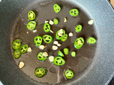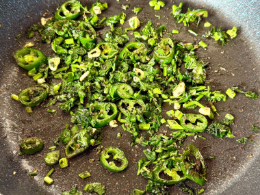 Пока варятся макароны, в сковороде на небольшом огне разогрейте растительное масло. Добавьте чеснок и перец чили и обжарьте 1-2 минуты. Следите, чтобы чеснок не подгорел. Добавьте в сковороду измельченную зелень, соль и перец и перемешайте. Выключите огонь. О том, как правильно выбрать растительное масло и сковороду, читайте в отдельной статье, ссылка в конце рецепта.