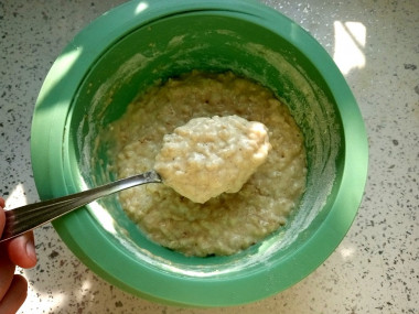 Остудите овсяную кашу. Вбейте в миску с кашей яйцо и перемешайте. Всыпьте просеянную муку, соединенную с разрыхлителем. В зависимости от качества муки её может понадобиться чуть больше или чуть меньше. О муке и её свойствах, а также о нюансах работы с разрыхлителем, подробнее можно прочитать в отдельных статьях, ссылки в конце рецепта.
