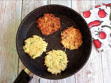 Для жарки разогрейте скороду и налейте растительное масло на 2-3 мм. Ложкой выкладывайте немного картофельной массы и обжаривайте на небольшом огне с двух сторон.