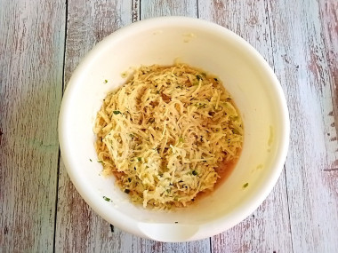 Все ингредиенты перемешайте до однородного состояния. Если из картофеля появится сок - его необходимо будет слить.