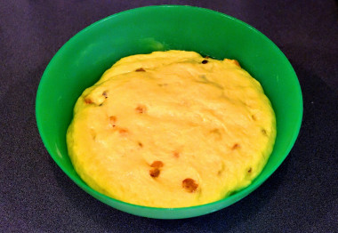 В изюм всыпьте 1 ст. л. муки и перемешайте. Всыпьте изюм в тесто и перемешайте, чтобы изюм равномерно распределился. При необходимости подсыпайте понемногу еще муки, но не забивайте тесто мукой, иначе в готовом виде тесто получится слишком плотное и невкусное. Пусть оно останется слегка липким. Липкость уйдет во время подъема и раскатывания теста. О муке и её свойствах подробнее можно прочитать в отдельной статье, ссылка в конце рецепта.
