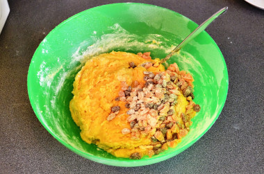 Отдельно смешайте сахар, ванильный сахар, соль, куркуму, желтки, оставшееся теплое молоко, сметану и теплое растопленное сливочное масло.