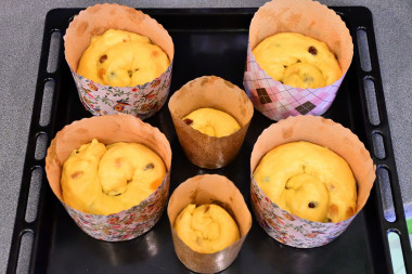 Бумажные формы для кулича смажьте растительным маслом. Выложите в формы заготовки, накройте пленкой и оставьте для подъема на 1 час. Я заполняла формы на половину, и у меня получились достаточно плотные куличи. Если вы хотите получить более воздушную и пышную выпечку, то заполняйте формы на 1/3 или даже 1/4.