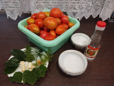 Как сделать маринованные помидоры на 3 литровую банку на зиму? Сначала подготовьте все необходимые ингредиенты по списку. Заранее простерилизуйте банки и крышки к ним. О том, как это сделать, а также других тонкостях консервации читайте в статьях про заготовки, ссылки в конце рецепта. По желанию в банку можно добавить пару горошин черного перца.