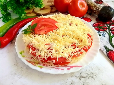 Повторите слои — натертый сыр, дольки помидоров, майонез. Я сделала одно повторение, вы можете увеличить количество слоев.