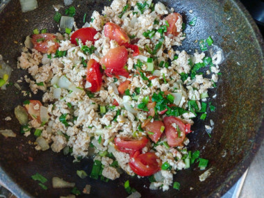 На сковороду налейте немного растительного масла. Когда оно достаточно нагреется, выложите репчатый лук, перец и фарш. Добавьте соль и специи по вкусу. Перемешайте и жарьте на сильном огне до готовности фарша - куриный фарш готовится быстро, примерно 10 минут. Добавьте томатную пасту и зеленый лук, перемешайте и через 1 минуту огонь выключите. Начинка готова.