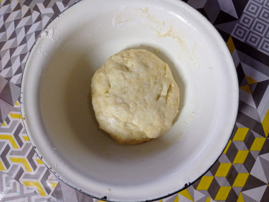 Влейте горячую воду температурой примерно 50-60 градусов. Начните замешивать тесто в миске ложкой, а затем переложите его на присыпанный мукой стол и домесите руками до нужного состояния: тесто должно хорошо отставать от рук и получиться эластичным и мягким. При необходимости добавьте ещё немного муки. Сделайте из теста шар, оберните пакетом и дайте полежать 20 минут.