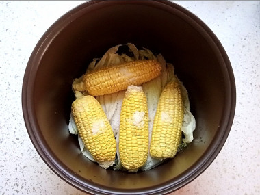 Сверху выложите початки. Влейте горячую воду. У меня ушло 2 литра. Вам воды может понадобиться больше или меньше. Но следите, чтобы она не превышала допустимой верхней риски на чаше, иначе при сильном кипении вода будет выплескиваться из краев.