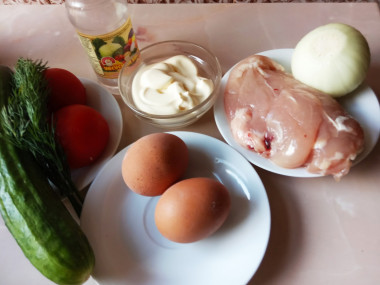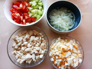 Как сделать салат с курицей и маринованным луком? Подготовьте для этого необходимые ингредиенты. Пропорции для салата даны примерные и их, вполне, можно немного их изменить на свой вкус. Куриное филе заранее отварите в кипящей воде около 30 минут и остудите.