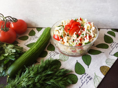 Салатик очень нежный) Буквально вчера готовила)) правда огурцов у меня не было, я добавила мелконарезанную капусту. С огурцами бы конечно было свежее и сочнее, но их не было.... Салатик отличный - готовиться из того, что практически всегда есть в холодильнике. Еще одно достоинство салатика - это относительная простота в его приготовлении. Отличный рецепт, спасибо автору!!! Всем приятного аппетита))