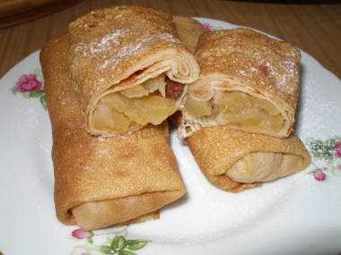 На середину каждого блина выкладываем яблочную начинку. Скатываем блины трубочкой. Посыпаем сахарной пудрой.