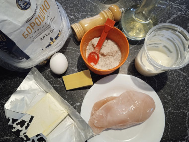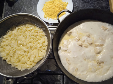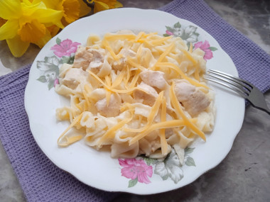 Мне понравилась эта паста с куриным филе и беконом. Решила повторить, но без добавления бекона. Домашнюю пасту я приготовила самостоятельно из домашнего яйца и муки, отварила и промыла. Кусочки куриного филе обжарила на сливочном и растительном масле. Затем протушила в сливках до загустения. Из специй положила соль и свежемолотый перец. Добавила в сковороду домашнюю лапшу, размешала и разложила по тарелкам. Перед подачей посыпала тёртым сыром. Выбрала голландский твердый сыр.