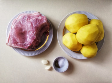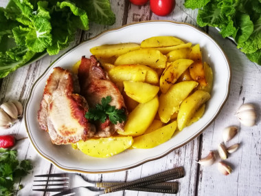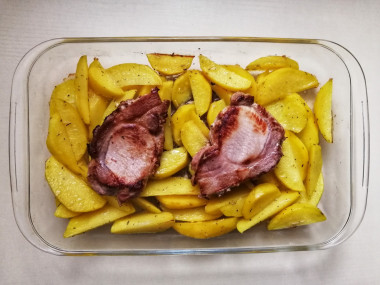 Как сделать картошку по-деревенски с мясом в духовке? Проще некуда! Специи можете дополнять или заменять по своему вкусу. Свинину можете заменить на любое другое мясо, но учтите, что время приготовления, вкус и калорийность блюда изменятся. Часть туши выбирайте по своему вкусу. Это может быть окорок, лопатка, корейка, карбонад, шея, вырезка и т. д. У меня порционные корейки на кости. Заранее включите духовку на 190 градусов