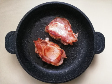 Пока картошка запекалась, занялась мясом. С корейки срезала косточку, разрезала мясо  вдоль на два стейка и обжарила на сильном огне до золотистой корочки. Затем выложила корейку в форму с картошкой, закрыла её фольгой и поставила в духовку на 20 минут.