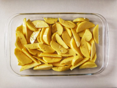 Выложите нарезанную картошку в миску. Полейте оливковым маслом, посыпьте приправой для картофеля, сухим чесноком, солью и перцем. Тщательно перемешайте.