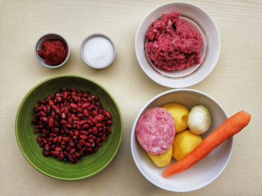 Как сварить суп из фасоли красной консервированной с мясом? Подготовьте необходимые ингредиенты по списку. Томатную пасту в этом рецепте можно заменить на помидоры в собственном соку, свежие помидоры или кетчуп. Количество овощей в супе указано примерно, можно менять пропорции на свой вкус. У меня смешанный фарш из свинины и говядины, но можно взять любой другой.