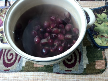 Когда вода начнет кипеть (виноградинки всплывут) добавьте сахар. Варите компот, помешивая, чтобы растворился сахар, 4-5 минут, после чего выключите огонь, накройте кастрюлю крышкой и дайте компоту настояться.