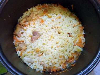 Выставите прибор на режим «Рис/Крупы» или «Каша» (в зависимости от модели вашей мультиварки) на 35-40 минут до выпаривания лишней влаги. После звукового сигнала мультиварку выключите. Перемешайте рис с мясом. Оставьте на 10 минут под закрытой крышкой. Точное время приготовления зависит от ваших вкусовых предпочтений и особенностей работы вашей мультиварки. Подробнее об этом читайте в отдельной статье по ссылке в конце рецепта.