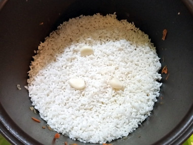 Всыпьте промытый рис и положите целые очищенные зубчики чеснока.