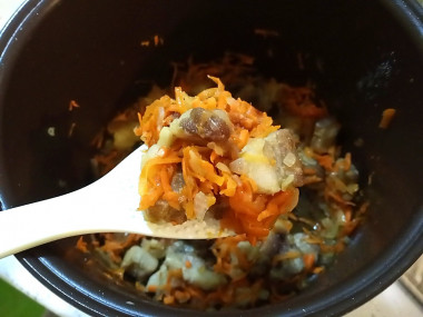 Добавьте к мясу лук, морковь и перемешайте. Жарьте, помешивая, до золотистого цвета овощей 5-7 минут. Влейте часть горячей воды, чтобы она полностью покрыла мясо. Готовьте оставшееся время до мягкости мяса. В конце мультиварку выключите.