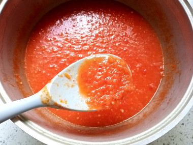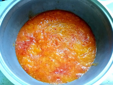 Переложите всё в кастрюлю, желательно с толстым дном. Добавьте растительное масло, соль и сахарный песок. Перемешайте соус, поставьте на плиту и дайте массе закипеть. С выбором кастрюли и растительного масла вам помогут статьи под рецептом.