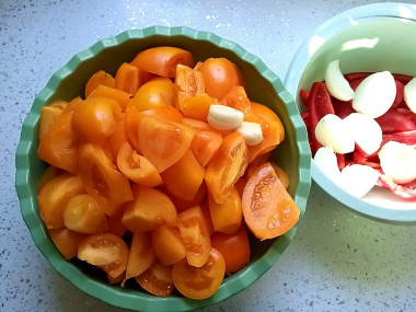 У меня остались желтые помидоры под обрезку. Сделала из них соус с помидорами болгарским перцем и чесноком на зиму. Перец для контраста взяла красный, а острый решила не добавлять. Все пропустила через мясорубку вместе с чесноком и луком.