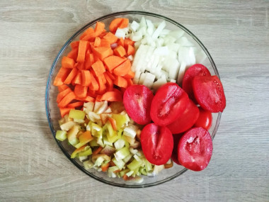 Морковь промойте под холодной проточной водой и обсушите бумажными полотенцами, очистите от кожуры ножом или овощечисткой и нарежьте кубиками средней величины. Репчатый лук очистите от шелухи, помойте и обсушите, нарежьте не сильно мелко. Сладкий перец помойте, обсушите, срежьте верхушку, удалите сердцевину и нарежьте средними кубиками. Все подготовленные овощи после нарезки должны быть примерно одинакового размера.