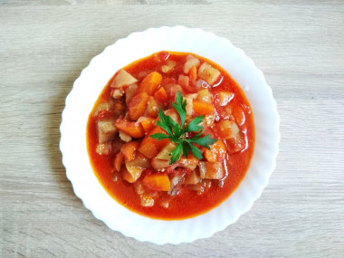 Блюда из тушеных баклажанов, помидоров и перца есть в кухнях многих народов: венгерское лечо, французское рататуй, кавказское аджапсандал. Этот рецепт - их упрощенный и быстрый родственник.