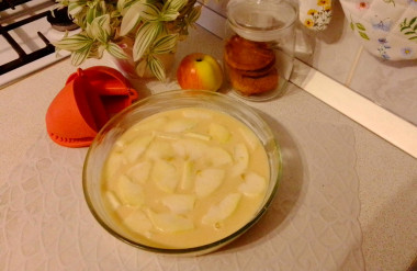 Тесто действительно получилось жидковатым, не как на бисквит, например. Но в духовке оно "схватилось" и вышел прекрасный пирог. Яблоки у меня красные сладкие, но с толстой шкуркой, которую я срезала. Выкладывала дольки на дно формы.