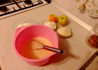 Хорошо, что автор указал, что тесто должно быть достаточно жидким по консистенции, таким оно и получилось. Оставила тесто на 20 минут до разбухания манки. Тем временем подготовила яблоки - у меня ушло 1 крупное яблоко.