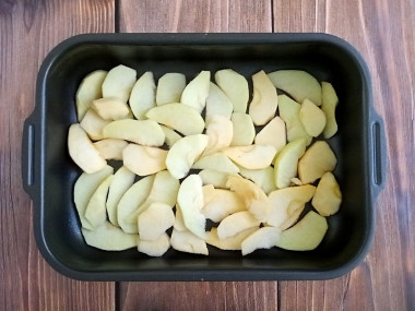 Возьмите подходящую форму для выпечки. У меня разъемная, диаметром 20см. Дно я выложила пергаментом. При необходимости смажьте форму небольшим количеством растительного масла. О том, как выбрать форму для выпечки, читайте в конце рецепта. Уложите на дно нарезанные яблоки. Учтите, что в этом случае они окажутся у вас внизу пирога, можете сделать наоборот, сначала налить тесто, а уже потом уложить яблоки. Повторюсь, что можно взять большее количество.