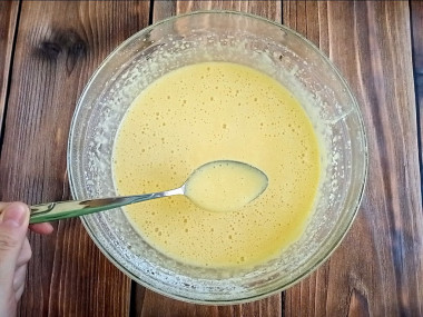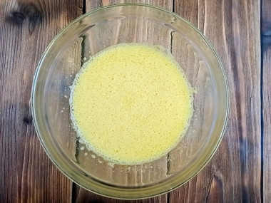 Яйца помойте и обсушите. Вбейте их в глубокую миску. Всыпьте к яйцам сахар и щепотку соли — она сбалансирует вкус выпечки. Количество сахара вы можете уменьшить по своему вкусу. Взбейте яйца с сахаром ручным венчиком. Будет достаточно добиться легкой пены.