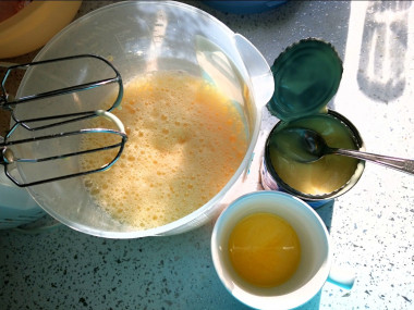 Возьмите миску и вбейте в нее яйца. Обязательно мойте яйца перед использованием, так как даже на кажущейся чистой скорлупе могут находиться вредные бактерии. Всыпьте к яйцам ванилин и влейте сгущенку. Как заменять ванилин читайте в статье в конце рецепта. Выбирайте качественное, проверенное сгущенное молоко. Без растительных жиров и пищевых добавок. В составе должно быть только два ингредиента: молоко и сахар.