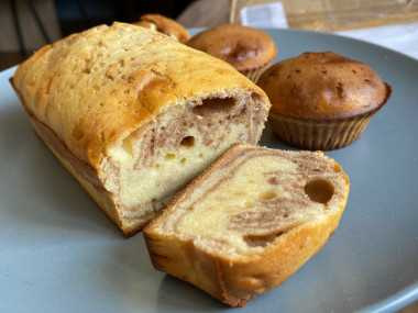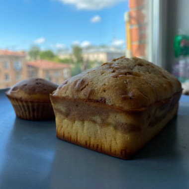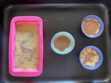 Ингредиентов брала в 2 раза меньше: получился 1 небольшой кекс и 3 кексика. Готовое по рецепту тесто разделила на 2 части и в одну из них добавила 2 чайных ложки какао-порошка. Затем выложила слоями и отправила в духовку.