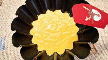 Возьмите подходящую форму для выпечки. Для этого рецепта подойдет любая жаропрочная форма. Если используете силиконовую форму, то промазывать ее маслом или маргарином не нужно. А вот металлическую, керамическую или стеклянную посуду лучше слегка смазать растительным маслом, чтобы выпечка не пригорела. Вылейте в нее тесто.