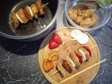 Оставьте мясо мариноваться минимум на полчаса, а лучше на несколько часов. Промаринованное мясо нанижите на шпажки попеременно с кусочками болгарского перца.