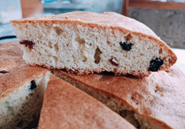 Количество сахара убавила до 150 г. И дополнительно к изюму добавила нарезанные кубиками финики (никогда раньше не использовала для выпечки, захотелось узнать, что получится).