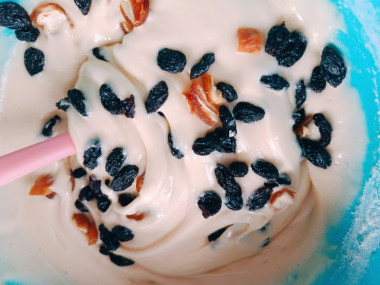 Тесто по консистенции получилось как густая сметана. Смешала с сухофруктами и выложила в круглую форму (никак не обзаведусь прямоугольной для кекса...).