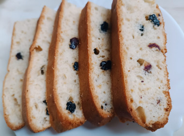 Кекс получился очень воздушный, пористый и мягкий внутри и хрустящий снаружи. Действительно отличается от бисквита (пеку довольно часто). Ну а сочетание изюма и кусочков фиников очень даже понравилось.