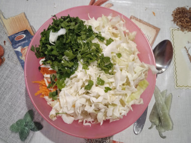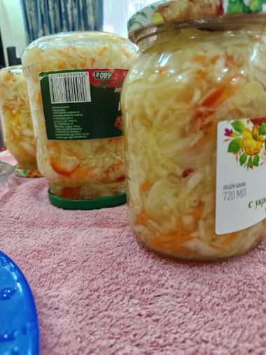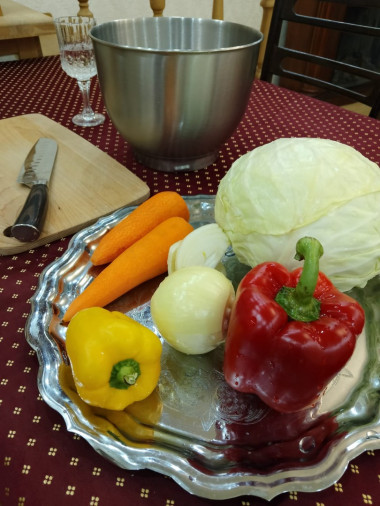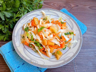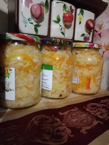 Мне очень понравился рецепт - салат осенний с капустой перцем и морковью на зиму. Решила попробовать приготовить на ужин. Взяла свежие овощи - капусту, болгарский перец, лук и морковь. Всё почистила, вымыла. Мелко нашинковала белокочанную капусту, порезала кубиками лук, сладкие перцы тоже нарезала кубиками, морковку потерла на тёрке с крупными отверстиями. От себя ещё добавила измельчённую зелень свежей петрушки. Всё смешала и распространился великолепный аромат свежего салата. Решила не закатывать, а сделать пробную порцию. Заправила салат рафинированным маслом, столовым уксусом, сахарным песком и солью. Вышло просто и со вкусом. Превосходный рецепт! Овощной салат красивый и аппетитный. Я выбирала перцы разных цветов для красоты. Заправка прекрасная. Сахар и соль отлично сыграли свою роль, для баланса вкуса самое оно. Салат и свежий, и хрустящий, и мега вкусный. Подавать можно с чем угодно. Нам так понравился салат, что теперь я готовлю его через день, но не в банки закатываю, а мы сразу съедаем свежий салатик. Кстати, чем дольше салат стоит в холодильнике (3 дня), тем он сочнее, появляется великолепная юшечка и овощи получаются вроде как маринованные. Идеальный рецепт! Всем советую попробовать! Большое спасибо автору!