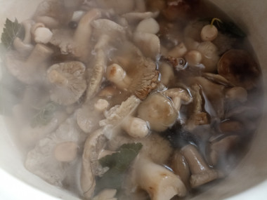 С помощью ложки уберите пену, которая образуется на поверхности. Огонь убавьте до среднего или низкого и варите грибы около 30 минут. Далее откиньте грибы на дуршлаг.
