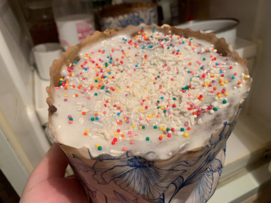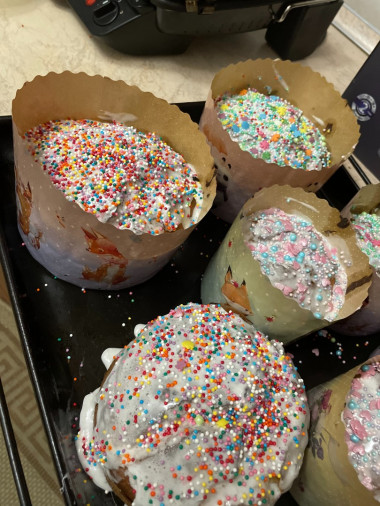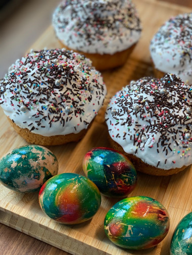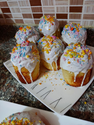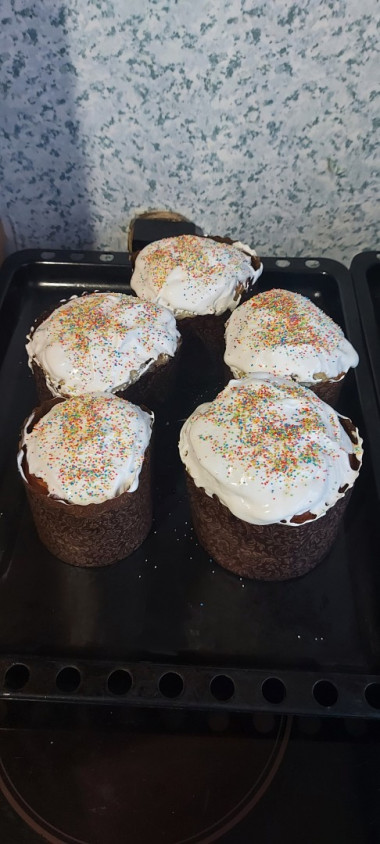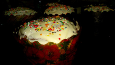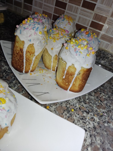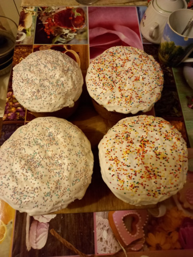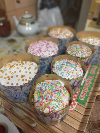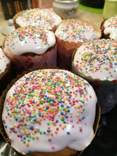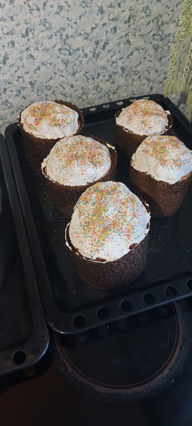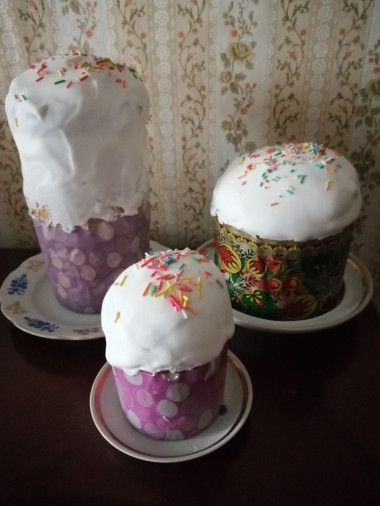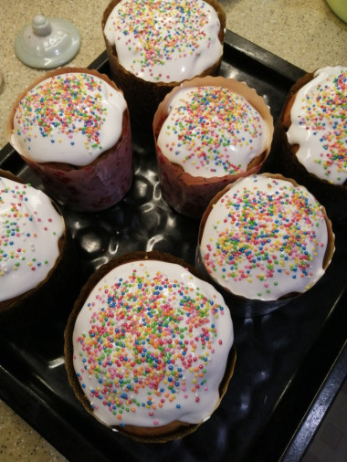 Доброго всем времени суток! Пекла замечательные куличики по вашему рецепту. Пеку уже много лет и всё время хочется чего-то новенького. От рецепта не отступала ни на шаг и вот он результат(это осталось от того, что было!), хорошо, что успела глазурь нанести хотя бы на оставшиеся куличики!!! Ах, какие они получились мягонькие, не приторные, воздушные и моментально съедаемые!!!! "Мои" такие просто обожают!!! Рецепту , несомненно, хвала и обожание!!!! СПАСИБО ЛЮБИМЫМ БАБУШКАМ!!! И АВТОРУ!!!